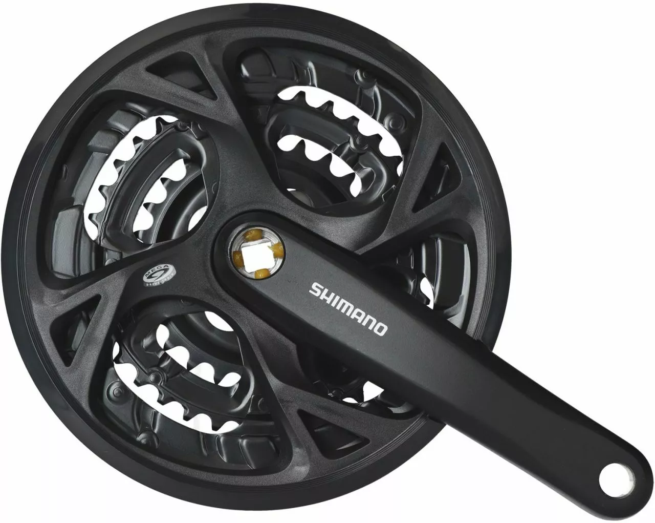 La biela cuadrada Shimano FC-M371 de 3 x 9 velocidades con anillo protector de cadena ofrece una transmisión fiable y garantiza un ritmo óptimo.