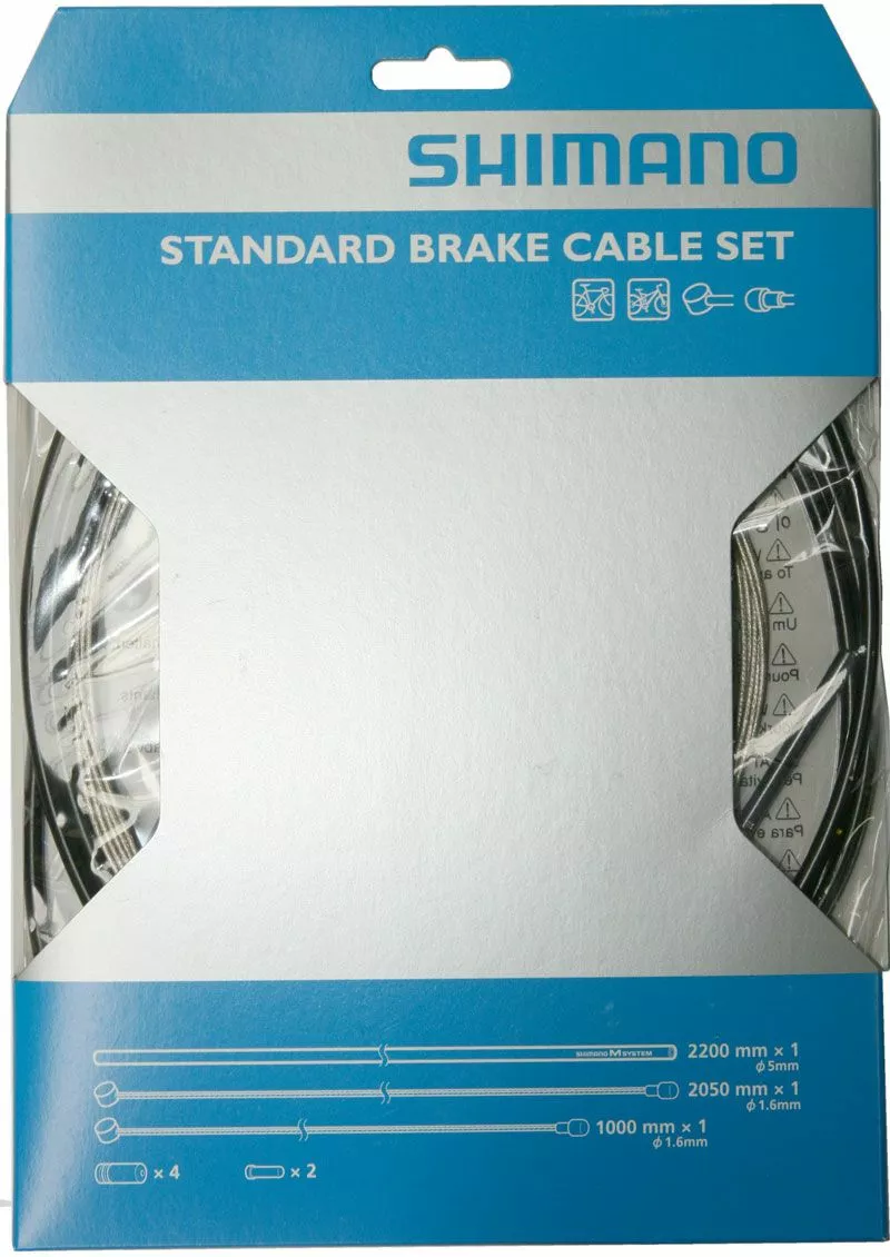 Juego de cables de freno estándar Shimano para MTB/bicicletas de carretera para el freno delantero y trasero, compuesto por funda exterior, cables interiores, manguitos finales y tapas finales.