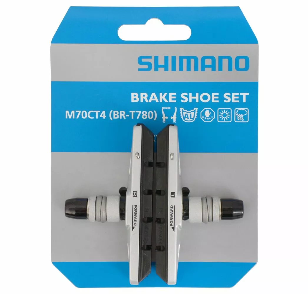 Zapatas de freno estándar Shimano para llantas de aluminio con flanco fresado. Poco desgaste de la llanta, poco ruido, buen rendimiento en condiciones húmedas y secas.